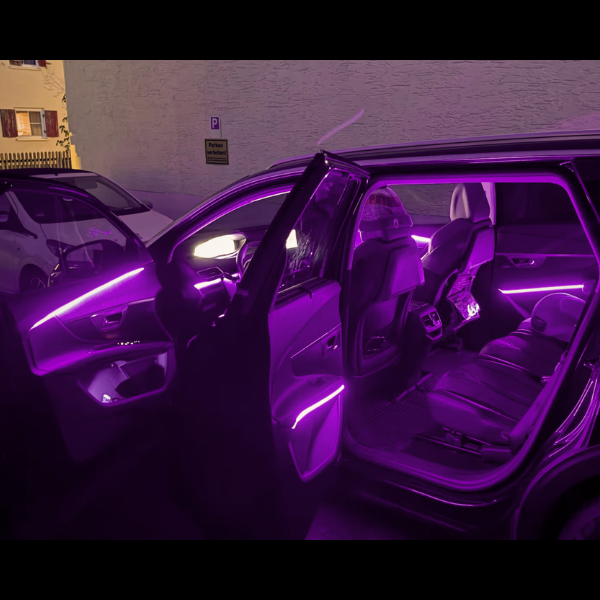Die Beleuchtung lässt sich individuell anpassen, mit bis zu 16 Millionen Farben, einstellbarer Helligkeit und verschiedenen Effekten wie Fade, Lauflicht, Rainbow oder eigenen Kreationen. So passt sie sich perfekt deinem Fahrzeug und deinem Stil an.